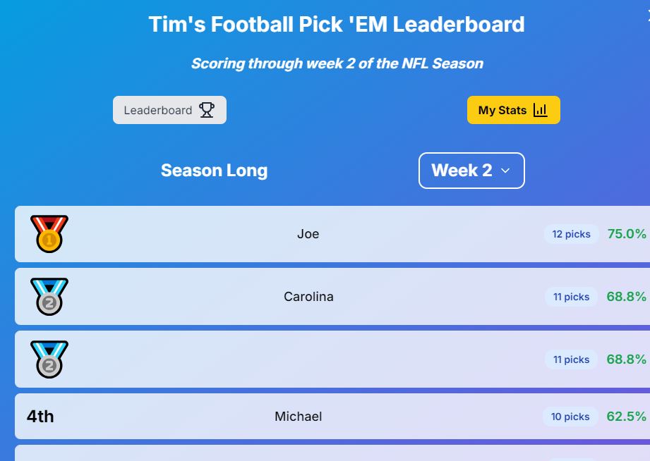 Week 2 winner of Tim's Football Pick 'Em Faceoff