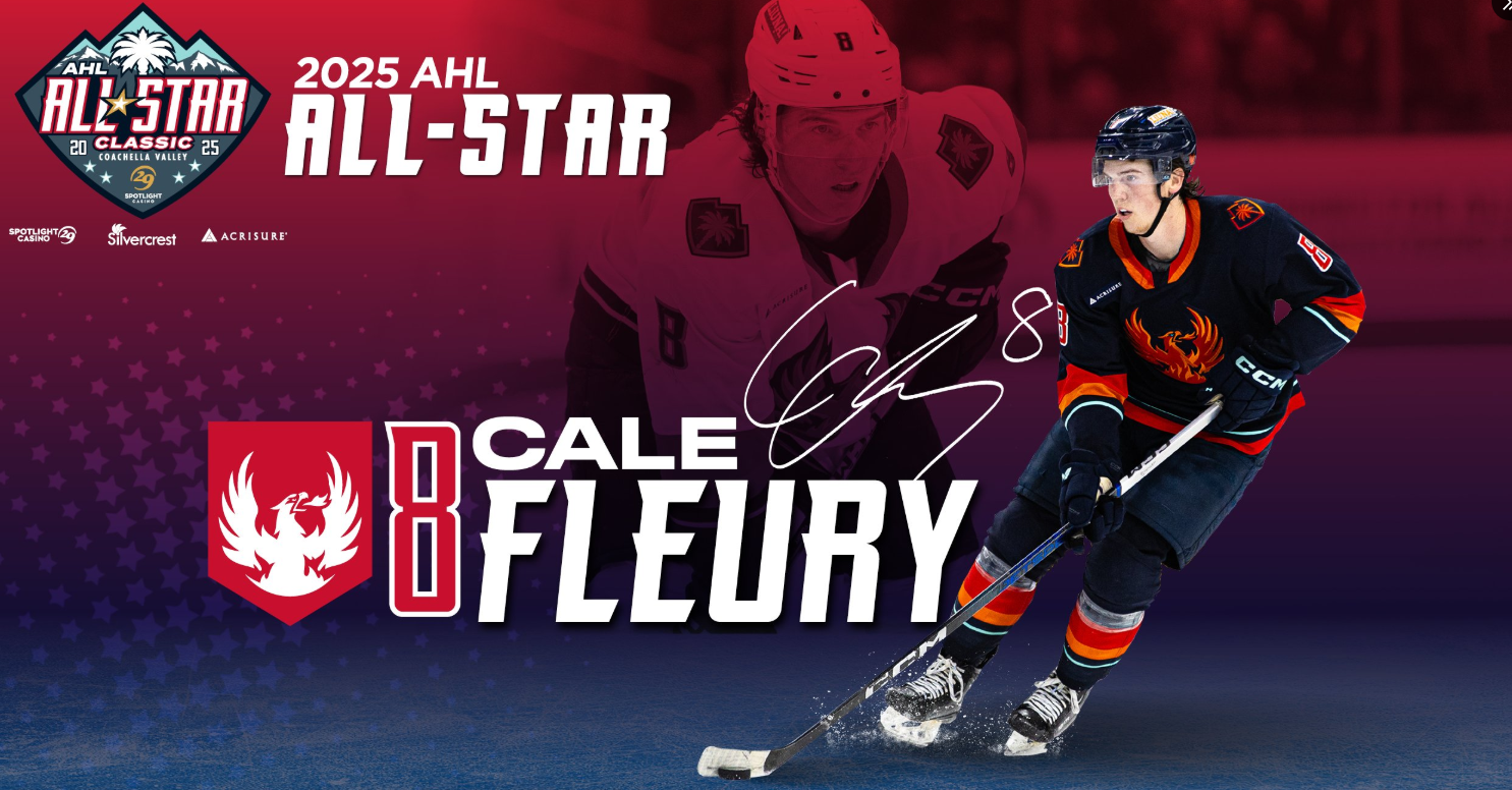 The American Hockey League announced today that the defenseman Cale Fleury will represent the Coachella Valley Firebirds and the Pacific Division at the 2025 AHL All-Star Classic, presented by Spotlight 29 Casino on Sunday, February 2 and Monday February 3 at Acrisure Arena.