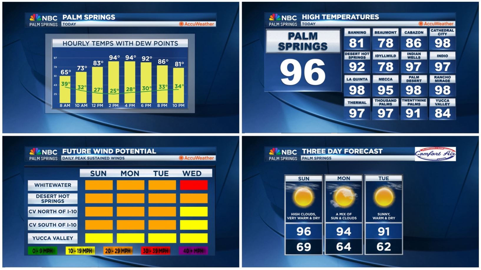 The Coachella Valley will see mostly sunny skies today with low relative humidity and very warm midday temperatures in the middle-to-upper 90s.