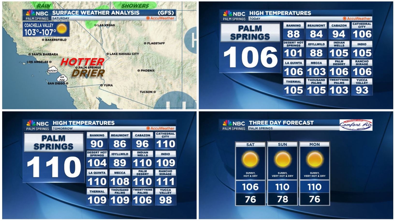Also -- as an upper-level high begins to nudge its way over the Southwest -- Palm Springs high temperatures will warm to 106° this afternoon, 110° for both Sunday and Monday.