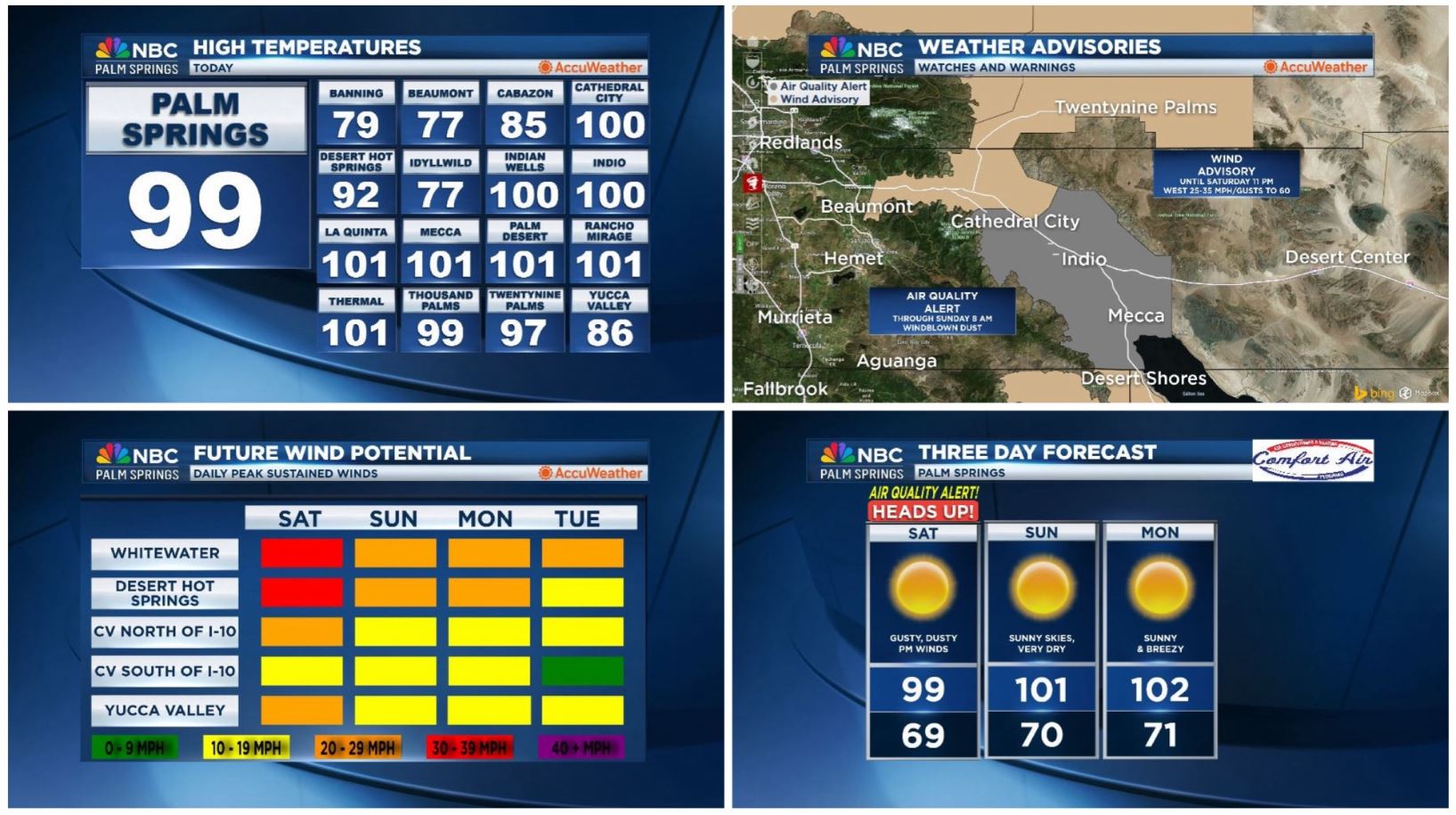 And because those Northwesterly winds will be elevating dust and dirt, an Air Quality Alert has been issued for the Coachella Valley through early Sunday morning.
